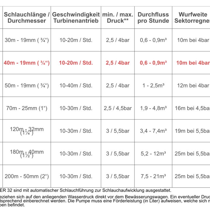 Überprüfen Sie, ob Arbeitsdruck und Wassermenge den angegebenen Werten entsprechen. Bringen Sie dazu ein Manometer am Gerät an. Bei zu großer Entfernung zur Wasserentnahme sinkt der vorhandene Druck bzw. die Wassermenge. Wählen Sie den Anschlussschlauch immer eine Nummer größer als den Schlauch auf dem Leader.
