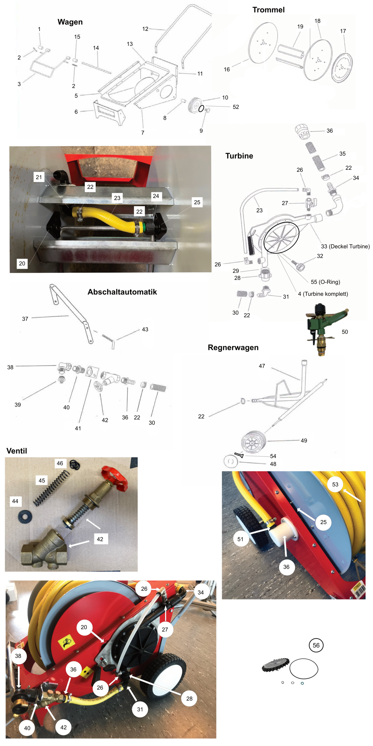 Zusätzlich sollte sichergestellt sein, dass die Leitung nicht durch Schmutz oder Fremdkörper blockiert wird. Überprüfen Sie dazu die Turbine am Turbineneingang, den Schlauchanschluss, den Regnerwagen und den Sektorregner. u. a. durch Abschrauben der Düsen.