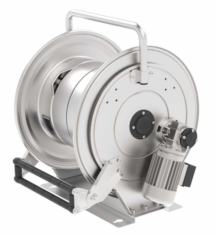 Der Schlauchaufroller OSE stellt mit seinem Elektroantrieb und einer Kapazität von 50 Metern ¾“-Schlauch eine elektronische Alternative zum OSM 710 dar.