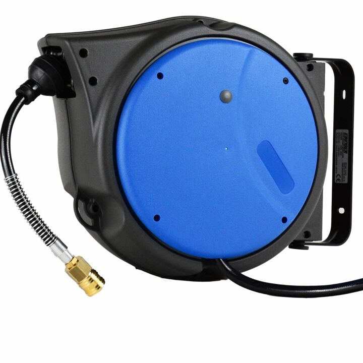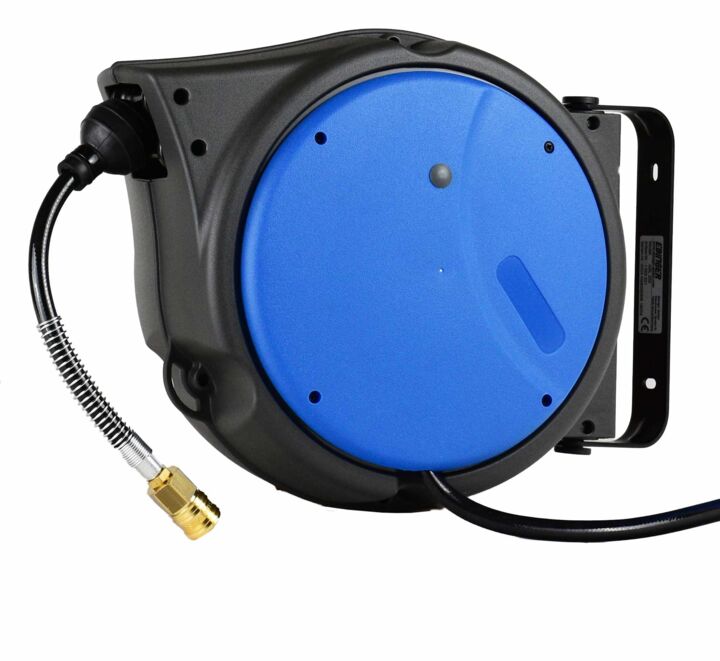 • Federrückzug für eine gleichmäßige und mühelose Aufwicklung des Schlauches, um Stolperfallen zu vermeiden und die Sicherheit am Arbeitsplatz zu erhöhen