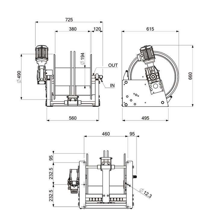 • Durch den Elektromotor 230V AC, 750W, 1,6A, manuell auskuppelbar für Motorfreilauf, ist ein Schlauchausziehen ohne Motorwiderstand möglich, selbst bei großen Schlauchlängen