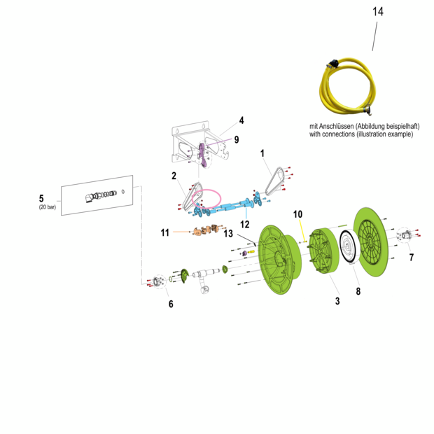 • Anschlüsse: Eingang (Drehgelenk): MS-Schnellkupplung, kompartibel System Geka, Ausgang (Schlauch): MS-Schnellkupplung, kompartibel System Geka