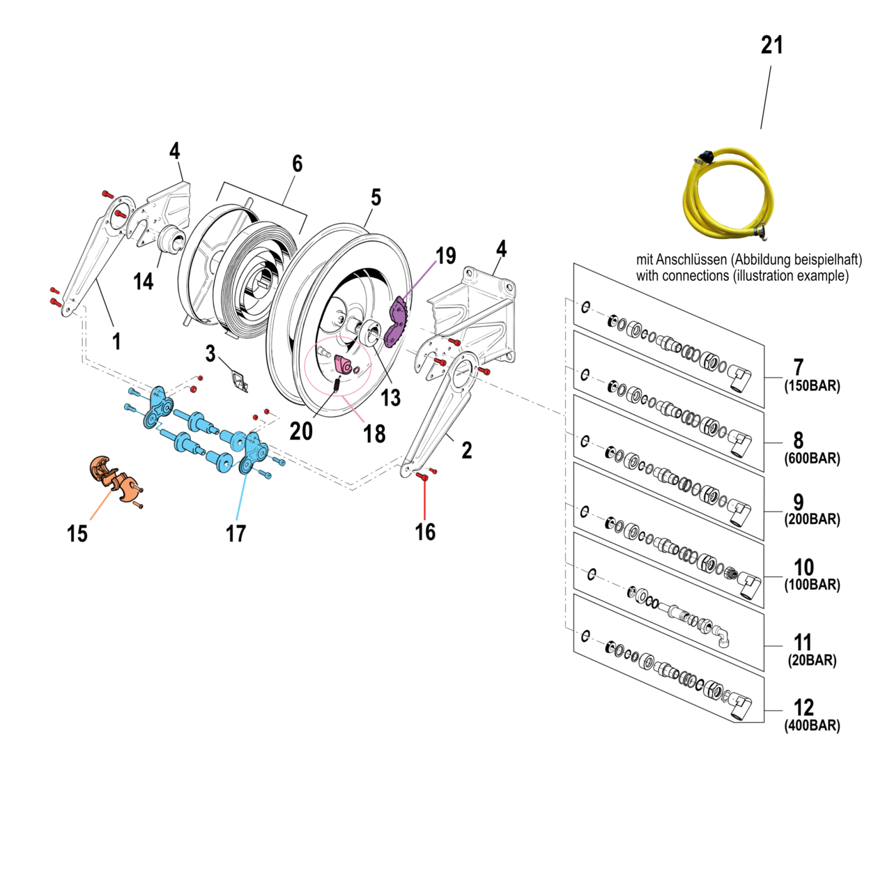 • Anschlüsse: Eingang (Drehgelenk): MS-Schnellkupplung, kompartibel System Geka, Ausgang (Schlauch): MS-Schnellkupplung, kompartibel System Geka