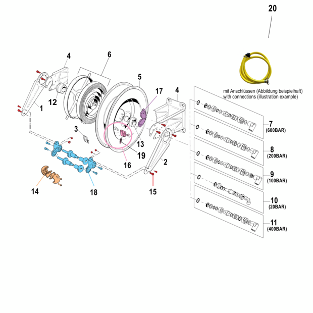 • Anschlüsse: Eingang (Drehgelenk): MS-Schnellkupplung, kompartibel System Geka, Ausgang (Schlauch): MS-Schnellkupplung, kompartibel System Geka