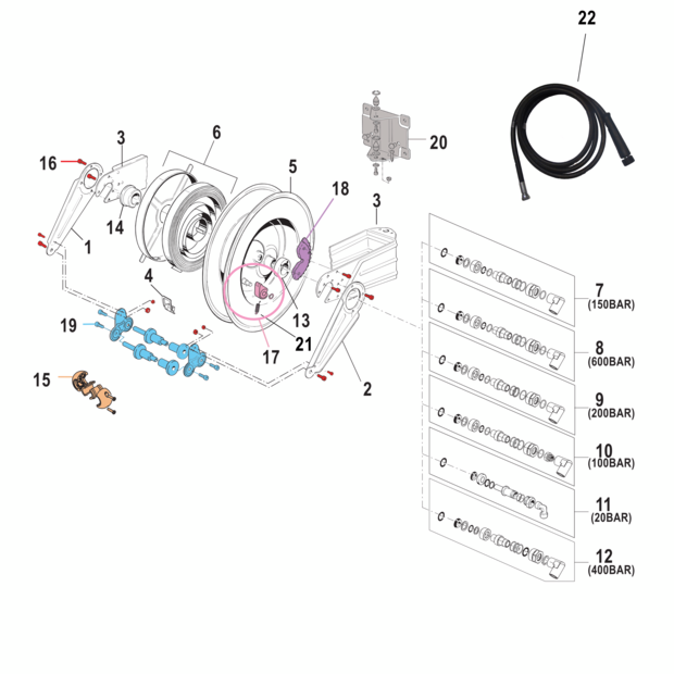 • Anschlüsse: Eingang (Drehgelenk Edelstahl): 22 x 1,5 AG - Ausgang (Schlauch): 22 x 1,5 IG Überwurfmutter
