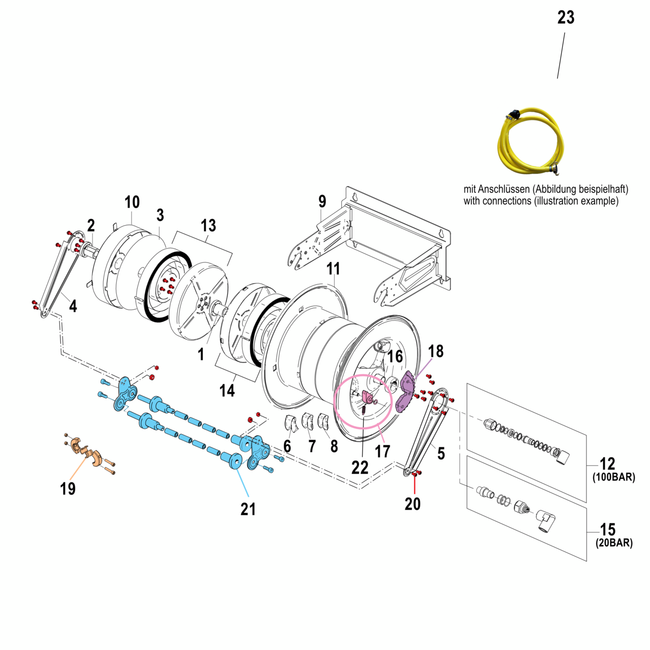 • Anschlüsse: Eingang (Drehgelenk): MS-Schnellkupplung, kompartibel System Geka, Ausgang (Schlauch): MS-Schnellkupplung, kompartibel System Geka
