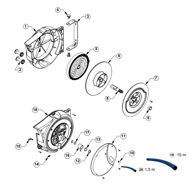 • Federrückzug für eine gleichmäßige und mühelose Aufwicklung des Schlauches, um Stolperfallen zu vermeiden und die Sicherheit am Arbeitsplatz zu erhöhen