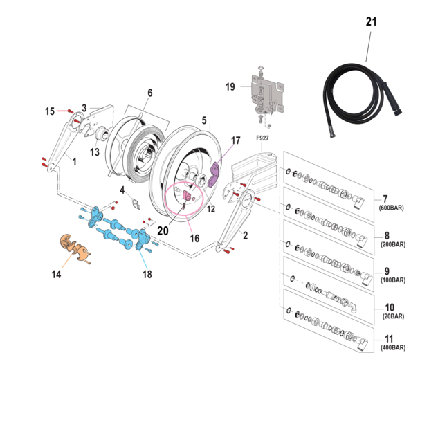 • Schlaucharretierung zur Fixierung des Schlauches bei jeder Umdrehung