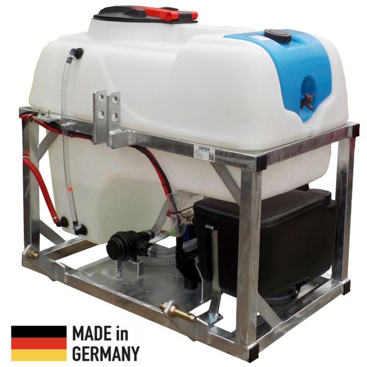 Die Spritzgeräte ist serienmäßig ausgestattet mit einem Spülsystem zur Systemreinigung. Durch einfaches Betätigen eines 3-Wege Hahn kann nach der Applikation auf das Spülsystem umgeschaltet werden und das System gereinigt werden. Dies spart erheblich Zeit beim Reinigen und Rückstände von Pflanzenschutzmitteln im System werden optimal beseitigt. Ein im Tank integrierter Handwaschbehälter liefert Frischwasser für den Anwender bei Kontaminationen.