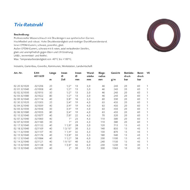 • Hochwertiger und robuster Wasserschlauch aus EPDM-Gummi mit synthetischen Druckträgern.